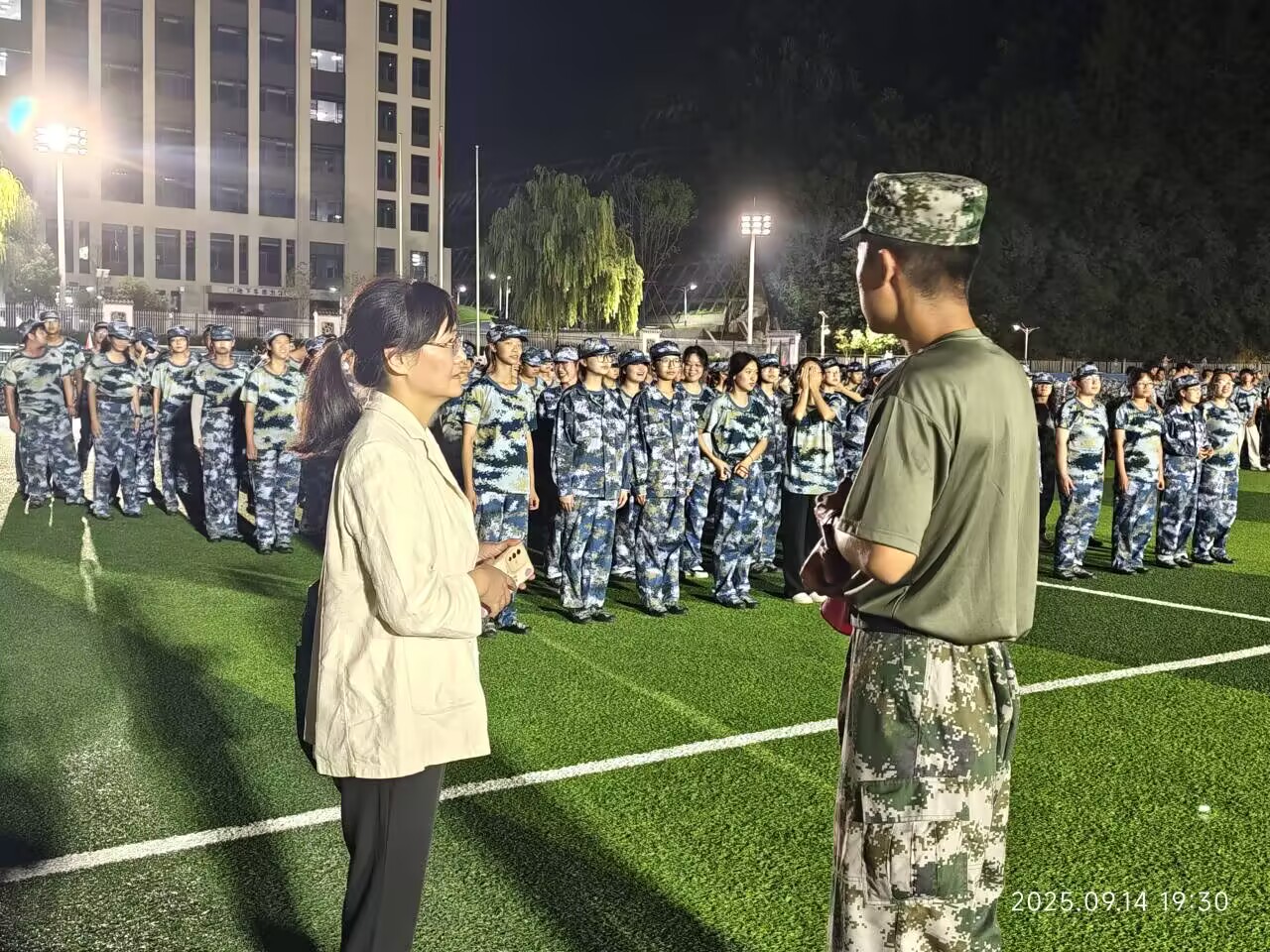 “安全”始终是军训工作的底线。学院分党委书记任自玲多次亲临训练场慰问,与新生交流训练心得,为大家加油鼓劲,将学院的温暖与期许送到一线。辅导员与六名班导轮班值守,全程跟班陪伴,穿梭在训练场上实时关注新生状态:发现有同学面色苍白,立即递上温水、安排休息;看到队列动作不规范,耐心配合教官指导纠正。他们用细致关怀筑牢安全防线,成为炎炎烈日下新生们最坚实的“守护伞”。