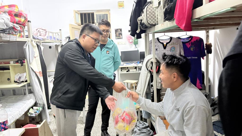 走访过程中,罗书记与陈老师先后走进多间学生寝室,将满载关怀的月饼、特色零食递到学生手中,递上的是一份心意,更是学院对学生的挂念。每至一间寝室,罗书记都与同学们亲切交谈,细致询问大家近期的生活状况、在校住宿体验以及因假期未归而产生的思乡情绪。针对25级新同学,罗书记重点了解了入学以来的学业适应情况,并结合自身经验给予切实建议,鼓励新同学们“尽快转变角色,打好专业基础”,呼吁其积极调整心态,融入大学节奏。