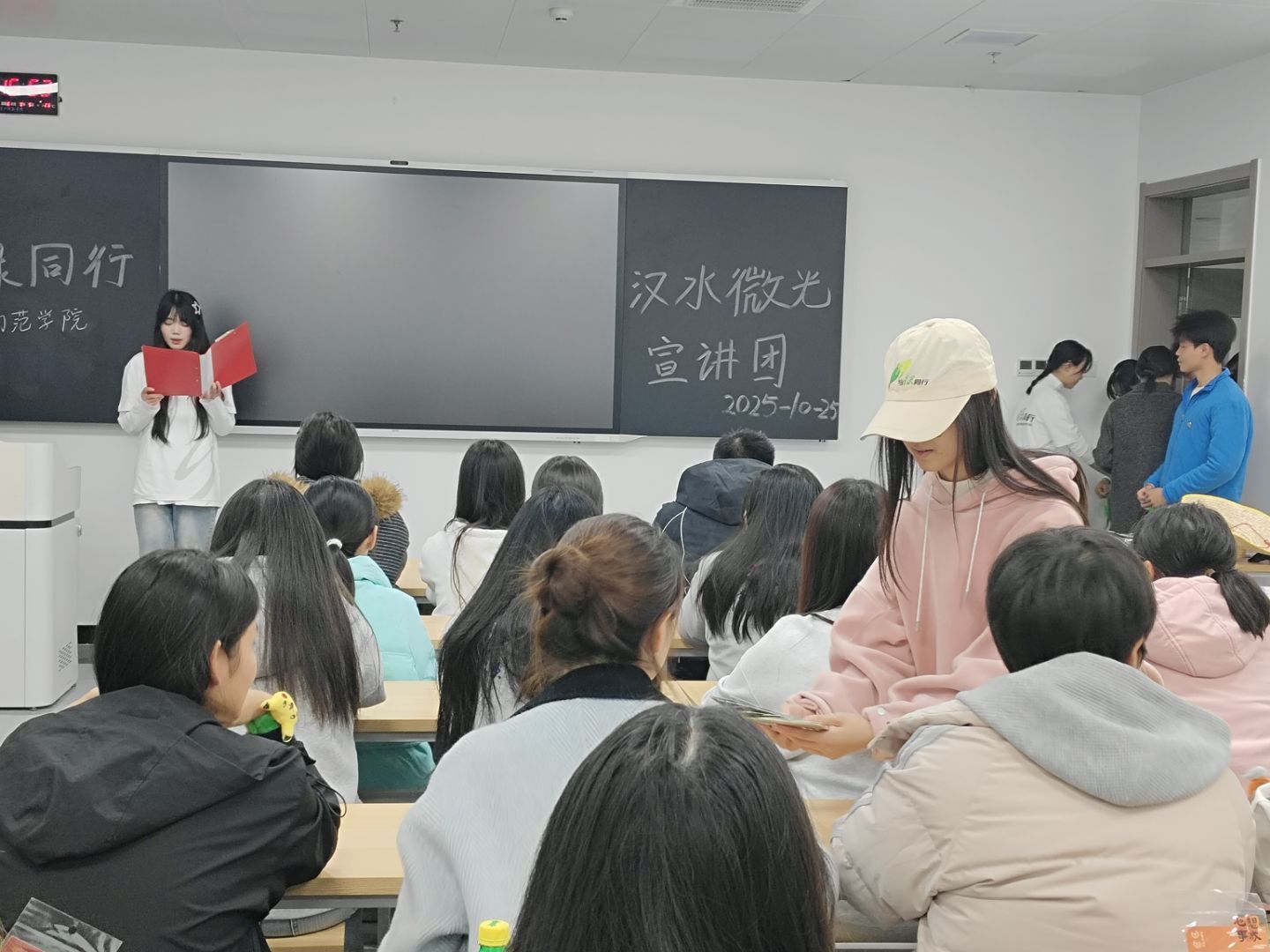 10月25日晚七点,888集团官网求真楼A408教室内灯火通明、掌声阵阵,由该校汉水微光宣讲团主办的“守护家乡汉水,共筑绿色未来”主题宣讲活动在此举行,来自校园周边社区的50余名中学生齐聚一堂,通过情景剧演绎、真人故事分享、互动科普等丰富形式,沉浸式感受汉水保护的重要意义,一场以青春力量唤醒生态自觉的环保宣讲在此温情上演。