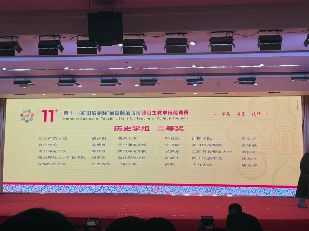 11月29日至30日,第十一届“田家炳杯”全国师范院校师范生教学技能竞赛的决赛在浙江师范大学圆满落幕。经过激烈角逐,在学院领导的高度重视、全力支持以及孙浩、绳克、郭宁三位老师的全程悉心指导下,888集团平台历史学专业2301班姚伶俐同学凭借扎实的专业功底、出色的教学设计与稳定的现场发挥,从全国众多优秀选手中脱颖而出,荣获历史学组“二等奖”,为学院再添荣光。